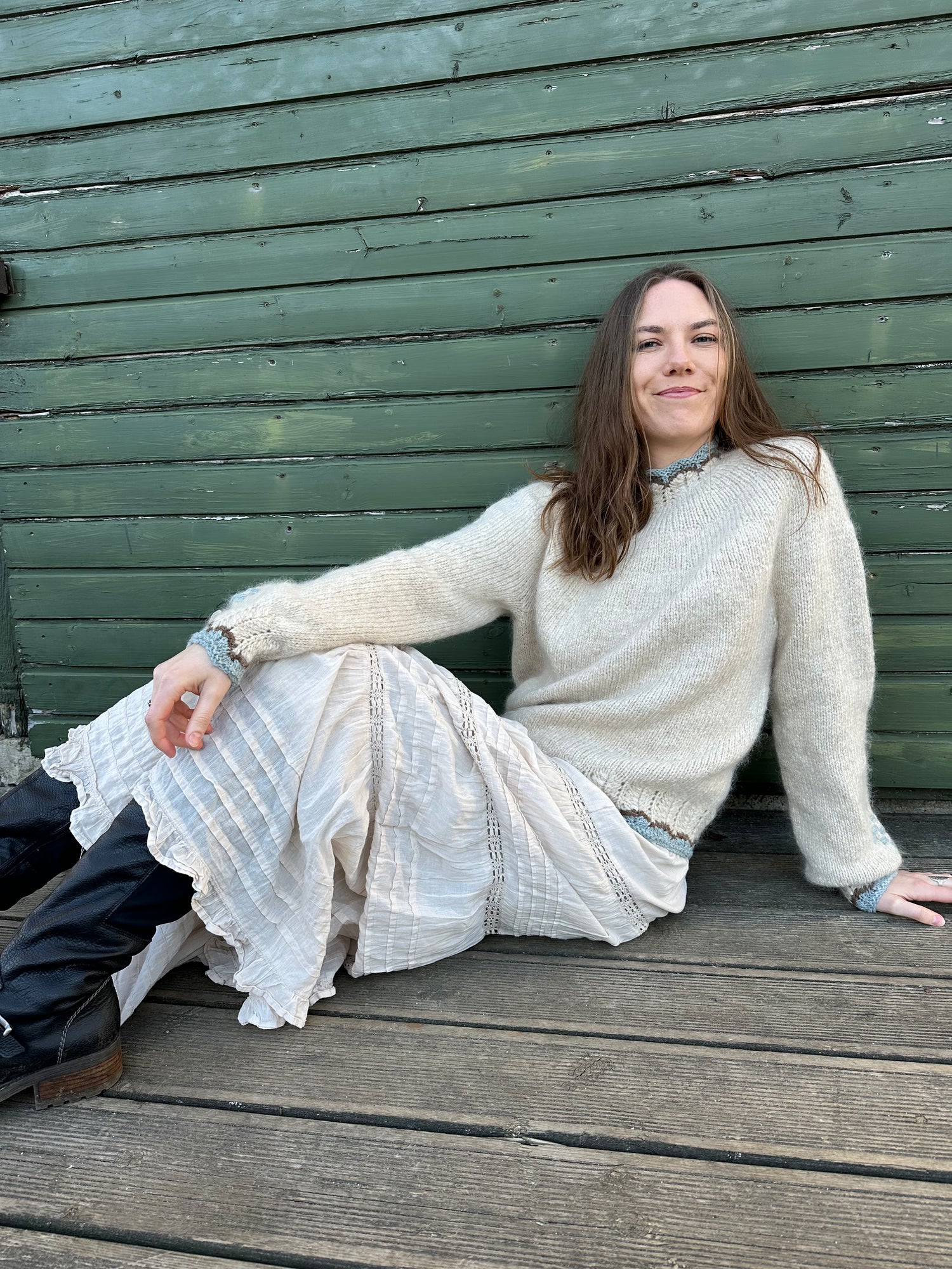 Lyøsweater med hulmønster har en slids i nakken, hulmønster ved kanterne og en dekoration med Roosimine teknikken på ærmerne.
