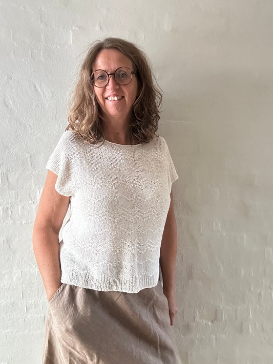 Lyø Tee er en skøn sommertop når det er rigtig varmt. Den er strikket i Hør Silke fra Gepard som er en flot blanding med et lækkert skær.