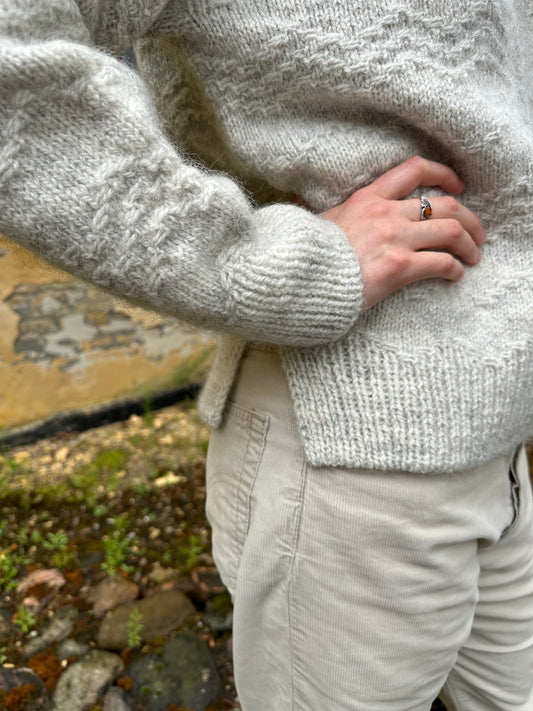 Lyø Sweater med vævestrik strikkes oppefra og ned. Har slids i siden og et flot mønster i vævestrik